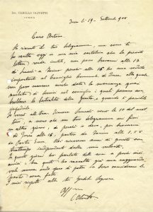 OLIVETTI CAMILLO, 3 lettere (2 autografe firmate, 1 dattiloscritta con firma autografa) inviate allo scienziato Alessandro Artom. Datate 1908.