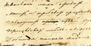 Sono presenti molte correzioni e cancellature, e la croce tracciata dall'autore su tutta la pagina fa supporre che si tratti di un abbozzo non utilizzato. (Si ringrazia il Prof. Fausto Malcovati - Università degli Studi di Milano). Aleksandr Puškin (Mosca 1799 - San Pietroburgo 1837), autore di poemetti e liriche, di opere in prosa (tra queste La dama di picche, 1834), di testi per il teatro (Boris Godunov, 1831) e del celebre romanzo in versi Evgenij Onegin (1831), è considerato il fondatore della moderna lingua russa.