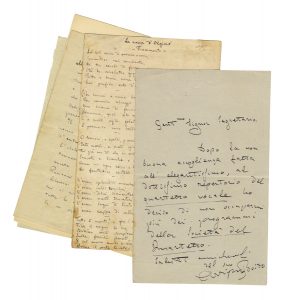 Manoscritti a inchiostro nero. Scritte 14 pagine in totale. 5 buste conservate. Dimensioni varie. (10)