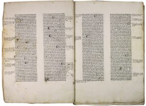 In-folio (mm 408x285). Carte [287 su 288]. Segnatura: [a12 b-g10 h12 i-m10 n12 o-t10 v12 x-z8 A-D10 EF8(-F8)]. Testo in carattere romano (R122) su 44 linee. Esemplare mancante dell'ultima carta; legatura originale in assi e ¼ di cuoio (staccata dal corpo del volume), 4 nervi su pelle di capra allumata, 2 fermagli e due tenoni originali in cuoio e metallo sul taglio davanti; ai centro dei fascicoli maculature in pergamena ms. di rinforzo per sostenere le cuciture; segnature mss a penna per uso del legatore; sulla coperta lignea anteriore ms. il titolo 'BAR SVP(ER) / TITVLO: SOL / MATRIMONIO/'; alla controguardia iniziale due formule di preghiera in latino (secc. XV-XVI in.) e stemma a penna non identificato con cinque scaglioni (in quelli di sinistra si intravede una scritta evanita); ai lati divisi da una spada al centro, al capo crescente con faccia umana e fiore con otto petali divisa dall' elsa della spada); parzialmente rubricato in inchiostro nero, rare postille marginali del XV-XVI secc. ineunte. Cfr. ISTC ib00230900; IGI 1368; GW 03612. Edizione impressa pagina per pagina in Trevi a cui si lavorava già il 5 luglio 1470 con carta proveniente da una cartiera appenninica (Foligno, Fabriano o Camerino) con il segno dell'aquila in cerchio. Colophon sottoscritto e datato dal prototipografo tedesco Giovanni Reinhard (che l'anno precedente aveva stampato, sempre nella città umbra, di Francesco Bartoli, Quomodo B. Franciscus petivit a Christo indulgentiam pro Ecclesia S. Mariae de Angelis , ISTC if00290400 IGI 1279, esemplare unico della Biblioteca Universitaria Alessandrina, Roma) in società con cittadini trevani e che si trasferì poi a Roma. Il volume è un monumento della prima tipografia italiana e dell'edizione sono ad oggi noti solo quattro esemplari, tre in Italia e uno nella Biblioteca Apostolica Vaticana. Dai documenti relativi alla società che lo produsse sappiamo che i caratteri utilizzati e un banco (probabilmente un torchio, infatti la società ne possedeva almeno sei) furono venduti al trevano residente a Foligno Evangelista Angelini il 22 novembre 1471 e che dunque la lega tipografica fu utilizzata a Foligno per gettare i caratteri con cui fu stampata da Neumeister l'editio princeps della Comedia dantesca. Pur nella brevità del periodo di attività e nella scarsa produzione la tipografia di Trevi rappresenta un importante momento nella storia della tipografia italiana proprio mentre la nuova arte si diffonde nella stessa Umbria (a Foligno e a Perugia) ad opera di “alamanni” che poi, come Neumeister, attivo a Foligno, e lo stesso Reinhard, tendono a raggiungere Roma, dove la stessa società trevana aveva – come a Perugia – un deposito di libri per la commercializzazione. Condotta in società con alcuni cittadini della piccola città e con l'aiuto per l'approntamento e la correzione del testo di Pietro Donato, dottore in leggi, il volume è il segno materiale, l'oggetto dell'arte, di un'avventura affascinante a cui ci si riferisce nella riga dopo il colophon scrivendo che “Aura silet puppis currens ad litora venit”. Bibl. Gli studi di riferimento sono quelli, sempre validi se pur antichi, di Tommaso Valenti , Per la storia della stampa in Italia: la più antica società tipografica (Trevi-Umbria 1470), “La Bibliofilia” XXVI, 1924, pp. 105-127 e La tipografia di Trevi e i suoi incunaboli, “Accademie e Biblioteche d'Italia”, V, 1933, quest'ultimo in linea