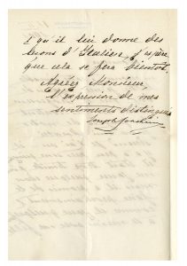 Manoscritto a inchiostro nero su carta intestata dell'autore. 1 bifolio, scritte 2 pagine. Busta conservata. Testo in francese.