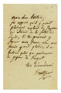 • "Mio caro Berton ho saputo che c'erano molti violoncellisti dell'Opera che erano alla festa di lunedì ; se tu potessi trovarvi mio fratello mi farebbe molto piacere, ha bisogno più di tutti di guadagnare dei soldi [...]". (originale in francese)