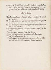 In-4° (mm 200x145). Carte [24]. Segnatura: a8, b-e4. Testo in carattere romano (R 110) su 30 linee. Spazi per capilettera con letterine-guida. Legatura un po' allentata internamente e una carta slegata ma buona conservazione. Cartonato rustico settecentesco con piccola lacuna al dorso. Alcune glosse di antica mano al testo. Editio princeps e unica conosciuta di questa «operetta erudita che in forma di dialogo ripropone un commento dell'ovidiana "Ibis", confuta un passo di Valerio Massimo e termina con alcune regole di ortografia latina» (DBI, ad vocem). Il suo Autore, umanista e maestro di Pandolfo e Carlo Malatesta, fu anche bibliotecario di Guidubaldo da Montefeltro, cui è dedicato questo volume. BMC V, 375; Goff A13; GW 129; IGI 10; Hain-Copinger 28; Pellechet 20.