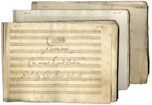 Manoscritto musicale. Parti d'orchestra (Violino Primo di Concerto, Violino Secondo di Concerto, Violino Primo di Ripieno, Violino Secondo di Ripieno, Viole obbligate, Violoncello obbligato, Basso di ripieno, Oboe I e II, Corno I e II, Fagotto obbligato, Forte Piano I e II).