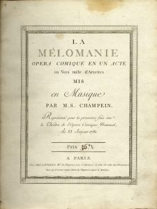 Champein Stanislas. Le Mélomanie. Opera Comique en un acte [...]. Représenté pour la premiere fois sur le Théâtre de l'Opéra Comique National le 23 Janvier 1781.