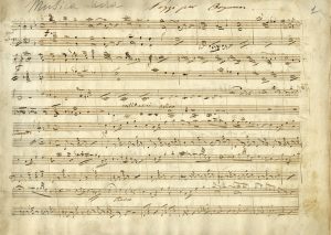Il manoscritto è a inchiostro marrone scuro su carta a mano con 12 pentagrammi.