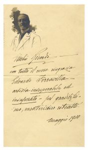 RICORDI GIULIO, Dedica autografa all'attore Edoardo Ferravilla su cartoncino con ritratto dello stesso Ricordi. Datata maggio 1910