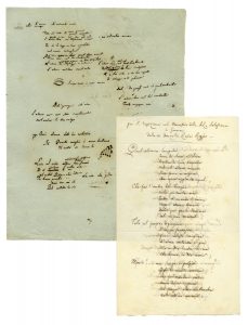 ROMANI FELICE, Insieme di carte autografe con schizzi, abbozzi, lettere, testi in prosa e poesia. Nell'insieme anche il testamento del poeta e una lettera (con allegato) relativi al diritto d'autore sui libretti d'opera realizzati da Felice...