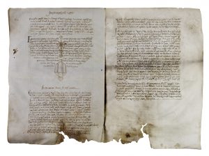 Manoscritto pergamenaceo in-folio (mm 350x245) a inchiostro seppia. Carte [4]. In latino. Un poco rovinato al piede con parziale perdita di testo.  Nel documento l’abate, direttore dell’Ospedale, compila attraverso l’ausilio di un notaio (su carta 3v un grande signum tabellionis) un elenco di possessi permutati con mercanti fiorentini. Vengono descritti i luoghi e i prezzi. Emergono rapporti con le famiglie fiorentine dei Benci e dei Capponi.