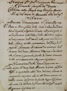 Sessione P:a del Sacrosanto Universale / et Generale Concilio di Trento / Celebrata sotto Pauolo terzo Pontefice Massimo. / Ali 13 del mese di Decembre lano [sic!] del Sog.re / 1645 [sic! 1545]. Non datato ma XVII secolo.