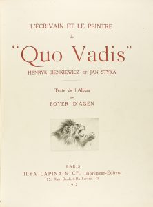 1912. LIBRO : (ARTE-CINE). SIENKIEWICZ, HENRYK ; STYKA, JAN. L´ÉCRIVAIN ET LE PEINTRE DE ´QUO VADIS´. Texto del álbum por Boyer d´Agen. Paris : Imp.-Ed. Ilya Lapina & Cie., 1912.