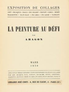 1930. LIBRO : (ARTE). ARAGON : LA PEINTURE AU DÉFI. EXPOSITION DE COLLAGES. ARP, BRAQUE, DALI, DUCHAMP, ERNST, GRIS, MIRÒ, MAGRITTE, MAN-RAY, PICABIA, PICASSO, TANGUY. MARS 1930. Paris : Libr. José Corti, 1930. 8º.