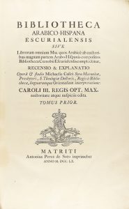 1760. LIBRO : (BIBLIOGRAFÍA). CASIRI, MICHAELIS : BIBLIOTHECA ARABICO-HISPANA ESCURIALENSIS SIVE LIBRORUM ONMIUM Mss. quos Arabicè ab auctoribus magnam partem Arabo-Hispanis compositos Bibliotheca Coenobii Escurialensis complectitur... TOMUS...