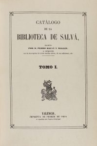 1872. LIBRO : (BIBLIOGRAFÍA). SALVA Y MALLEN, PEDRO:. CATÁLOGO DE LA BIBLIOTECA SALVA. Valencia : Imp. de Ferrer de Orga, 1872. 2 vol. en 4º mayor.