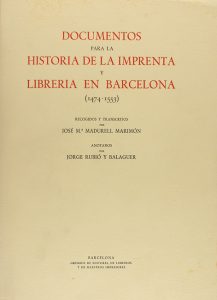 1955. LIBRO : (BIBLIOFILIA). MADURELL, JOSÉ M. ; RUBIÓ Y BALAGUER, JORGE:. DOCUMENTOS PARA LA HISTORIA DE LA IMPRENTA Y LA LIBRERÍA EN BARCELONA (1474-1553). Recogidos y transcritos por José Mª Madurell Marimón. Anotados por Jorge Rubió y...