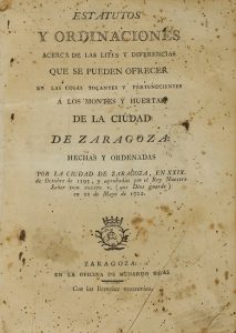 1732. LIBRO : (ZARAGOZA-DERECHO). ESTATUTOS Y ORDINACIONES ACERCA DE LAS LITES Y DIFERENCIAS QUE SE PUEDEN OFRECER EN LAS COSAS TOCANTES Y PERTENECIENTES A LOS MONTES Y HUERTAS DE LA CIUDAD DE ZARAGOZA. Zaragoza : Oficina de Medardo Haras, 1732. 8º.