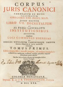 1735. LIBRO : [DERECHO]. GREGORIO XIII. / LANCELOTI : CORPUS JURIS CANONICI ACADEMICUM, EMENDATUM ET NOTIS P. LANCELLOTI ILLUSTRATUM, IN SUOS TOMOS DISTRIBUTUM, USUIQUE MODERNO AD MODUM CHRISTOPH. HENR. FREIESLEBEN ALIAS FERROMONTANI. Coloniae...