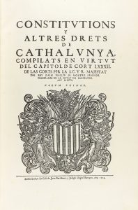 • PRAGMATICAS Y ALTRES DRETS DE CATHALUNYA... novament reimpresas conforme la disposició del Capítol LXXXII de las Corts celebradas en el Ciutat de Barcelona. Any MDCCII.: 2 h. + 213 p. + 3 h.