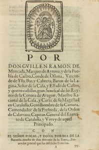 1648 ca. FOLLETO : [HITORIA-LÉRIDA]. [FELOAGA, FRANCISCO DE:]. POR DON GUILLEN RAMON DE MONCADA, MARQUES DE AYTONA [...] CAPITAN GENERAL DEL EXERCITO DE CATALUÑA Y VIRREY DE AQUEL PRINCIPADO. CON EL SEÑOR FISCAL Y DOÑA TORIBIA DE LA BARREDA,...