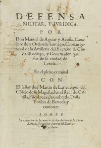 1649 ca. FOLLETO : CABRERA [NUÑEZ] DE GUZMAN, MELCHOR DE. DEFENSA MILITAR, Y JURIDICA POR DON MANUEL DE AGUIAR Y ACUÑA, CAVALLERO DE LA ORDEN DE SANTIAGO, CAPITAN GENERAL DE LA ARTILLERIA DEL EXERCITO DE CIUDAD RODRIGO, Y GOVERNADOR QUE FUE DE LA...