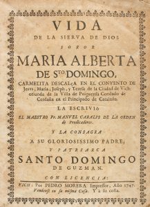 1747. FOLLETO : [HAGIOGRAFÍA-VIC]. CARALPS, MANUEL : VIDA DE LA SIERVA DE DIOS SOROR MARÍA ALBERTA DE SANTO DOMINGO, carmelita descalça en el convento de Jesús, María, Joseph y Teresa de Vich, oriunda de la Villa de Puigcerdà Condado de...
