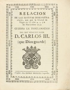 1759. FOLLETO : [FOLLETO]. RELACIÓN DE LAS FESTIVAS DEMONSTRACIONES CON QUE LA CIUDAD DE VIQUE en los dias 4, 5, y 6 de Noviembre 1759. Celebró la Proclamación del Rey Nuestro Señor D. Carlos III. Vich [Vique] : Pedro Morera Impressor, [1759]....