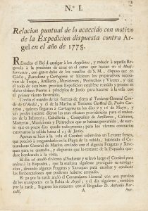 1775 ca. FOLLETO : [ARGEL]. RELACIÓN PUNTUAL DE LO ACAECIDO CON MOTIVO DE LA EXPEDICIÓN DISPUESTA CONTRA ARGEL EN EL AÑO DE 1775. ALICANTE 16 DE JULIO DE 1775. Madrid : s.imp.,[1775]. 8º mayor.