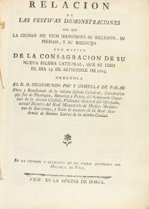 1803. FOLLETO : POU Y COMELLA DE PALAU, SEGISMUNDO : RELACIÓN DE LAS FESTIVAS DEMONSTRACIONES CON QUE AL CIUDAD DE VICH manifestó su religión, su piedad, y su regocijo con motivo de la Consagración de su nueva Iglesia Catedral, que se hizo el...