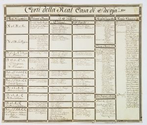 Manoscritto a inchiostro seppia (mm 265x320). 1 carta, scritta al recto. Il documento è relativo, probabilmente, alla corte di Vittorio Amedeo III di Savoia e di Maria Antonia Ferdinanda di Borbone, figlia del re di Spagna. Contiene i nomi (circa 200) dei “Primati e Dame”, degli “Scudieri” (primi e secondi) della “Regia Cappella”, della “Casa Reale” e della “Regia Camera”.