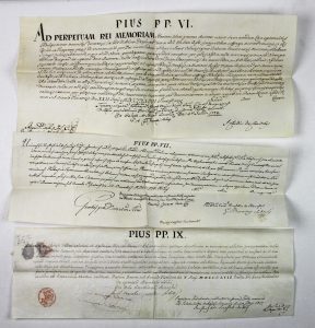 I manoscritti a inchiostro seppia su pergamena. Con timbri papali, una pergamena con sigillo in ceralacca e carta. Ottimamente conservate. Dimensioni varie. Carte con intestazione papale: Pio VI - Pio VII - Pio IX. Con firme di cardinali. Testi in latino. -