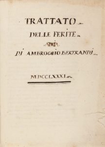 Manoscritto cartaceo in-4°(mm 220x160). Pagine 108 numerate a mano e con errori, [1] di indice, 1 bianca. Testo in inchiostro bruno, di una unica mano settecentesca. Piccola lacuna della carta al frontespizio. Legatura in piena pelle maculata con cornici impresse a secco ai piatti, decorazioni in oro ai comparti del dorso e titoli dorati entro tassello cartaceo al dorso; tagli rossi. Questo manoscritto - datato 1781 e quindi redatto dopo la morte del Bertrandi (1723-1770) - contiene il suo Trattato delle ferite, ancora inedito. Cfr. DBI, IX ad vocem «Il B. lasciò incompiuta una Geometria anatomica, una storia della chirurgia antica paragonata a quella moderna e altri scritti; tutto questo materiale fu pubblicato dopo la sua morte con il titolo Opere anatomiche e cerusiche di A. B., [...]. 1786-1802. Le Opere comprendono gli Opuscoli, il Trattato delle ferite...». Nella prefazione del volume III, che contiene una versione affine del nostro testo ma diversa per struttura e forse anche per i contenuti, si legge: «il presente Trattato delle ferite è stato dettato nel 1759., e nuovamente nel 1763».