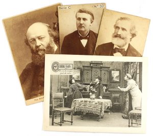 El lote incluye retratos realizados por Esplugas, Laureano, Chalot, NaDar, M. Couture, Reutlinger, etc. Algún retratado famoso como G. Verdi, Edison, MaqUés de Salisbury, etc.