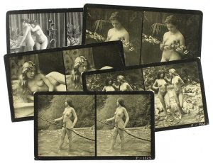 1890-1930. FOTOGRAFÍA : LOTE DE MÁS DE 60 FOTOGRAFÍAS ESTEREOSCÓPICAS. Acompaña el lote reproducciones más modernas de imágenes estereoscópicas, todas de desnudos masculinos y femeninos.