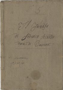Manoscritto cartaceo in-4° (mm 290x205) a inchiostro nero, alcune note a matita grigia. Pagine 36 scritte. Brossura dell’epoca con una mancanza. Carte legate con spago coevo. Al piatto inferiore alcune note manoscritte contengono il testo probabilmente della commedia di Goldoni Il buon compatriotto. Cancellature e correzioni nel testo. Alcuni versi modificati attraverso ritagli di carta coevi incollati. SI AGGIUNGE: Il Trionfo / di Federico Secondo / duca di Baviera. Datato 30 giugno 1811. Manoscritto cartaceo in-4° ( mm 280x195) a inchiostro nero. Brossura dell’epoca. In fine l’indicazione «Scritta da gioanni Piantone». Cancellature e correzioni nel testo.  I OPERA: Il Corvo è una delle prime fiabe teatrali di Gozzi. Fu composta nel 1762. Il nostro manoscritto presenta le “Mutazioni di scene”, i “Personaggi”, il “Trovarobbe” cui seguono i 5 atti della Favola. II OPERA: Il nostro manoscritto presenta i “Personaggi”, le “Mutazioni di scene”, cui seguono i 4 atti del teatro teatrale.
