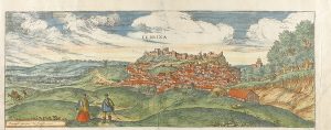 1590 ca. GRABADO : HOEEFNAGLE : LEBRIXA. Grabado al cobre, coloreados, plancha 15 x 41 cm, papel 18 x 44,5 cm.
