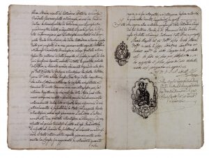 Manoscritto a inchiostro nero su carta bollata (mm 310x210). Carte 6 (5 scritte). Brossura in carta novecentesca. Documento redatto dal notaio Paolo Mazzoli di Modena. L’eredità è divisa in denaro, arredamenti, “nota dei capi”. -