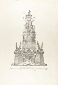 Dos grabados de momumentos funerarios, uno grabado por Carrera y litografiado por Gaspar a los bilbaínos sacrificados en aras de la patria ; el otro dibujado por Paul Decker y grabado por August Corvinus.