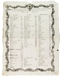 Documento a stampa e manoscritto (mm 410x310). 1 carta con filigrana. Il curioso documento contiene i prezzi (indicati a mano) di oltre 150 bevande vendute “alla bottiglia”, “al secchio”, “alla mezza bozza” e “in mezzi fiaschi”. Lazzaroni fu un celebre mercante di vini a Venezia.
