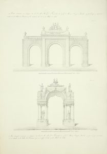 [Lam. 3ª] Arco triunfal contruido en obsequio de S.S. M.M. D. Fernando 7.º y Dª. Maria Josefa Amalia, y por el que pasaron á su entrada en la Villa de Tarrassa, que se verificó el dia 9 de Abril de 1828.