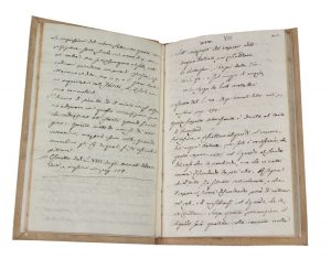 Manoscritto cartaceo in-4° (mm 180x110) a inchiostro nero. Carte 47 numerate da mano antica. Manoscritti compilati da un’unica mano. Cartonatura moderna in carta chiara. Fogli di guardia rinnovati. Carte ben conservate. I brevi saggi riguardano i seguenti argomenti: I – Vantaggi sulla coltivazione dei pomi di terra gialli. II – Mezzo canonico di alimentare la pubblica indigenza. III – Nuova coltivazione di pomi di terra. IV – Rapporto di uno sperimento pubblico intorno alla quantità di pane casalingo […]. V – Memoria sulla pittura del latte. VI – Mezzo di distruggere il mefitismo e di rendere sani gli ospitali […]. VII – Sull’impiego del sal marino per fissar il bianco di latte di calcina […]. VIII – Sull’impiego del vapore dell’acqua bollente per riscaldare le botteghe […]. IX – Metodo per tingere in bleu la lana grezza. X – Metodo per imbiancare in due giorni il cottone filato […]. XI – Sui mezzi di accrescere il calore prodotto da un combustibile […]. XII – Sulla maniera di togliere alle botti l’odor di muffa. XIII – Notizie sulla pittura a latte. XIV – Sulla composizione e uso della cioccolata. XV – Rimedi per incomodi stomatici. Alcuni di questi articoli, come annotato dall’anonimo trascrittore, sono apparsi negli “Annali delle Arti e Mestieri”.