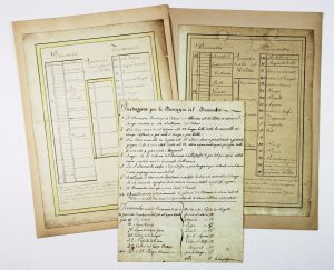 Manoscritto cartaceo (mm 260x200) a inchiostro seppia. 1 carta, scritta recto e verso. SI ALLEGANO: 2 tabelle relative al barometro, all’igrometro (scala del Deluc) e al termometro (scala di Reamur). Dimensioni: 300x215 mm. II DOCUMENTO: Nella tabella, la scala relativa al barometro, misurata in pollici di colonna di mercurio, riporta le condizioni meteo al variare della pressione barometrica. Interessante la previsione “terremoto” a 27 pollici di pressione. La scala relativa al termometro va dai 90 gradi ai -30. Vi si legge: 40 gradi temperatura del Senegal – […] – 15 gradi agrumi – 12 gradi colore della stufa […] – 20 (sottozero) «a questo grado di freddo fu distrutta tutta l’armata francese nel 1812 a Mosca».