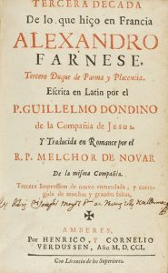 • DONDINO, GUILLELMO : TERCERA DECADA DE LO QUE HIÇO EN FRANCIA ALEXANDRO FARNESE, tercero duque de Parma y Placencia. : Portada + 438 p. + 6 grabados, dos plegados. CCPB 193820-7.