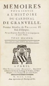 1753. LIBRO : (HISTORIA). LEVESQUE : MÉMOIRES POUR SERVIR A L´HISTOIRE DU CARDINAL DE GRANVELLE, PREMIER MINISTRE DE PHILIPPE II. ROI D´ ESPAGNE. París : Imp. Guillaume Desprez. 2 vol. en 8º.