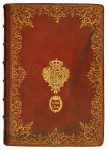 ► Preciosa encuadernación en tafilete granate con decoración de hierros dorados en encaje que enmarca el escudo real (Carlos III) y debajo otro escudete con corona y palmas cerrando las iniciales S.D.S. // I.D.A. Lomo con seis nervios, tejuelo de tafilete verde, y flor rodeada por pequeños hierros dentro de los compartimentos.