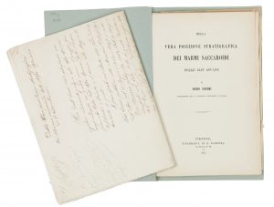 Manoscritto cartaceo in-folio (mm 340x232), a fogli sciolti. Carte 9 numerate a mano, scritte solo al recto, vergate in inchiostro bruno da bella e nitida grafia. Cancellature e correzioni della stessa mano, alcune annotazioni a matita di altra mano. SI AGGIUNGE: Cocchi Igino, Della vera posizione stratigrafica dei marmi saccaroidi delle Alpi Apuane. Estratto del Bollettino del R. Comitato Geologico d'Italia, maggio-giugno 1871. Firenze: tipografia Barbèra, 1871. Pagine 23, 1 bianca + 1 carta di tavola stratigrafica incisa in rame fuori testo e più volte ripiegata. Un fascicolo slegato. Brossura successiva. L'introduzione e i primi due paragrafi dell'opera del Cocchi sulle Alpi Apuane, di mano dello stesso Autore; si tratta molto probabilmente del menabò, come suggeriscono i ripensamenti e l'annotazione a matita presente sulla prima carta «Luigi / Manoscritto per il Bollettino geologico di giugno / La composizione si mandi al Sig...». Si aggiunge la versione a stampa dello studio opera dell'illustre geologo e paleontologo, primo presidente del Comitato geologico italiano, direttore della Società per lo sfruttamento marmifero delle Alpi Apuane.