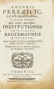 1782. LIBRO : (HISTORIA). PEREZII, ANTONII:. INSTITUTIONES IMPERIALES EROTEMATIBUS DISTINCTAE... Venetiis : Ex Typ. Balleoniana, 1782. 8º menor.