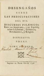 1796. LIBRO : (ENSAYO POLÍTICO). DESENGAÑOS SOBRE LAS PREOCUPACIONES DEL DÍA. Discursos Polemicos entre un Americano, y un Español, sobre la Libertad, Gobiernos, Revoluciones, y Religión. Roma : S. Imp., 1796. 2 tomos en 1 vol. en 8º menor.