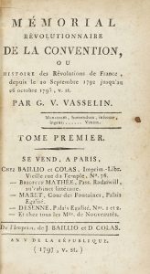 1797. LIBRO : (REVOLUCIÓN FRANCESA). VASSELIN, G. V. : MÉMORIAL RÉVOLUTIONNAIRE DE LA CONVENTION, OU HISTOIRE DES RÈVOLUTIONS DE FRANCE, DEPUIS LE 20 SEPTEMBRE 1792 JUSQU´AU 26 OCTOBRE 1795. Paris : Imp. J. Baillo et D. Colas, 1797. 2 vol....