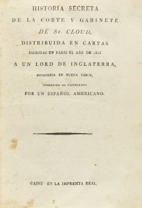 1805. LIBRO : (HISTORIA). HISTORIA DE LA CORTE Y GABINETE DE ST. CLOUD, DISTRIBUIDA EN CARTAS ESCRITAS EN PARIS EN EL AÑO DE 1805 A UN LORD DE INGLATERRA, REIMPRESA EN NUEVA YORK. Cádiz : Imp. Real, s.a. 8º mayor.