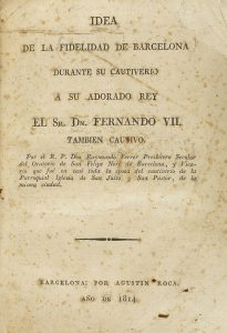 1814. LIBRO : (HISTORIA). FERRER, RAYMUNDO : IDEA DE LA FIDELIDAD DE BARCELONA DURANTE SU CAUTIVERIO A SU ADORADO REY EL SR. DN. FERNANDO VII, TAMBIÉN CAUTIVO. Barcelona : Ed. Agustín Roca, 1814. 4º menor.